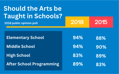 In the most recent survey, conducted in 2018, only 64% of Americans believe the arts make them a more creative person. Countered by a more positive statistic, 94% of Americans believe students should receive an education in the arts in elementary school, middle school, and high school.