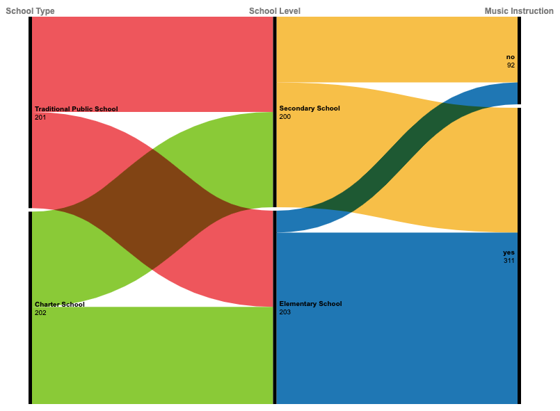 The vast majority of students not enrolled in art classes are represented by traditional public schools. Of this population, about half the recorded population is attending a secondary school where students typically have more freedom over their schedules. In cases where art courses are part of a mandatory curriculum, this mandated participation stops after the completion of elementary school. This theoretical conclusion may account for the drop in secondary school student enrollment in arts courses.