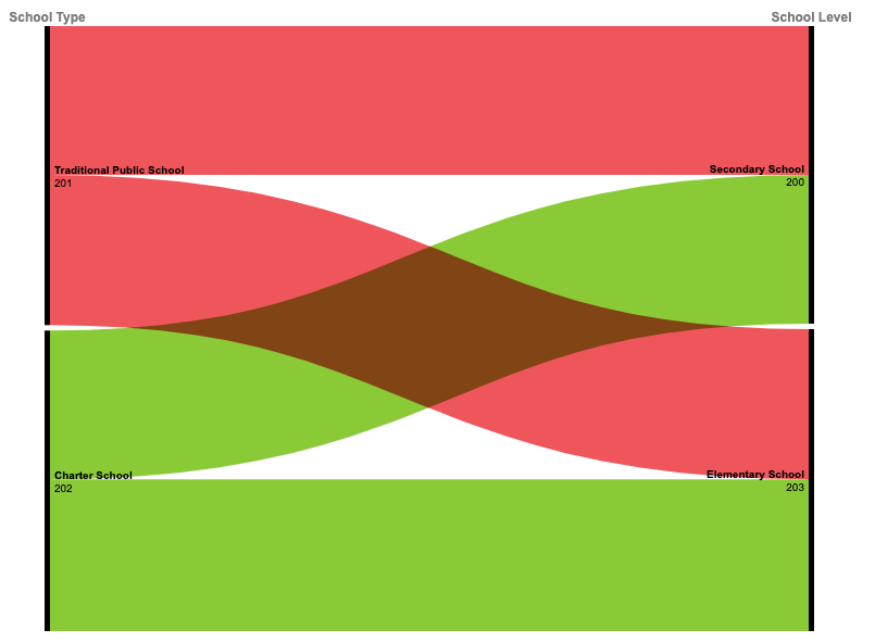 First, viewing enrollment through a lens of school type; a traditional public school versus a charter school. Data is then separated by grade level. Here, we see a comparison between secondary schools (grades 9 through 12) and elementary schools (grades 6 through 8).