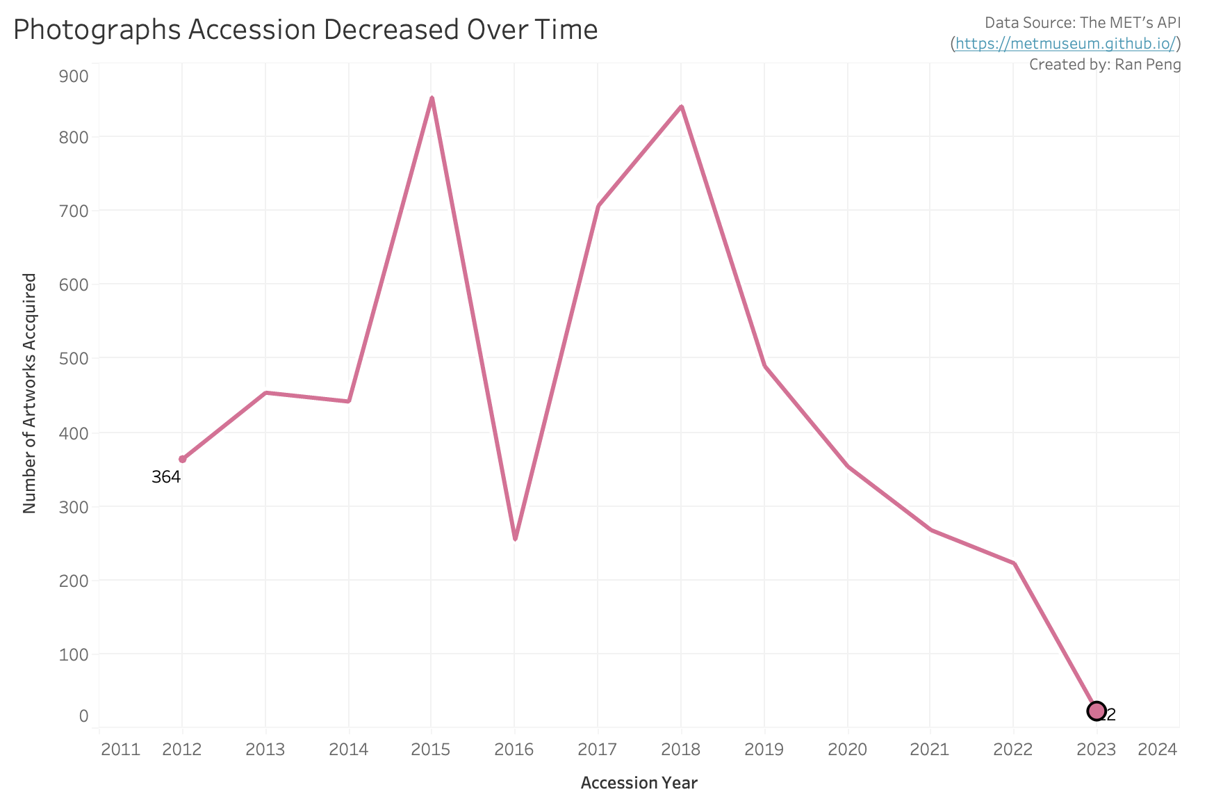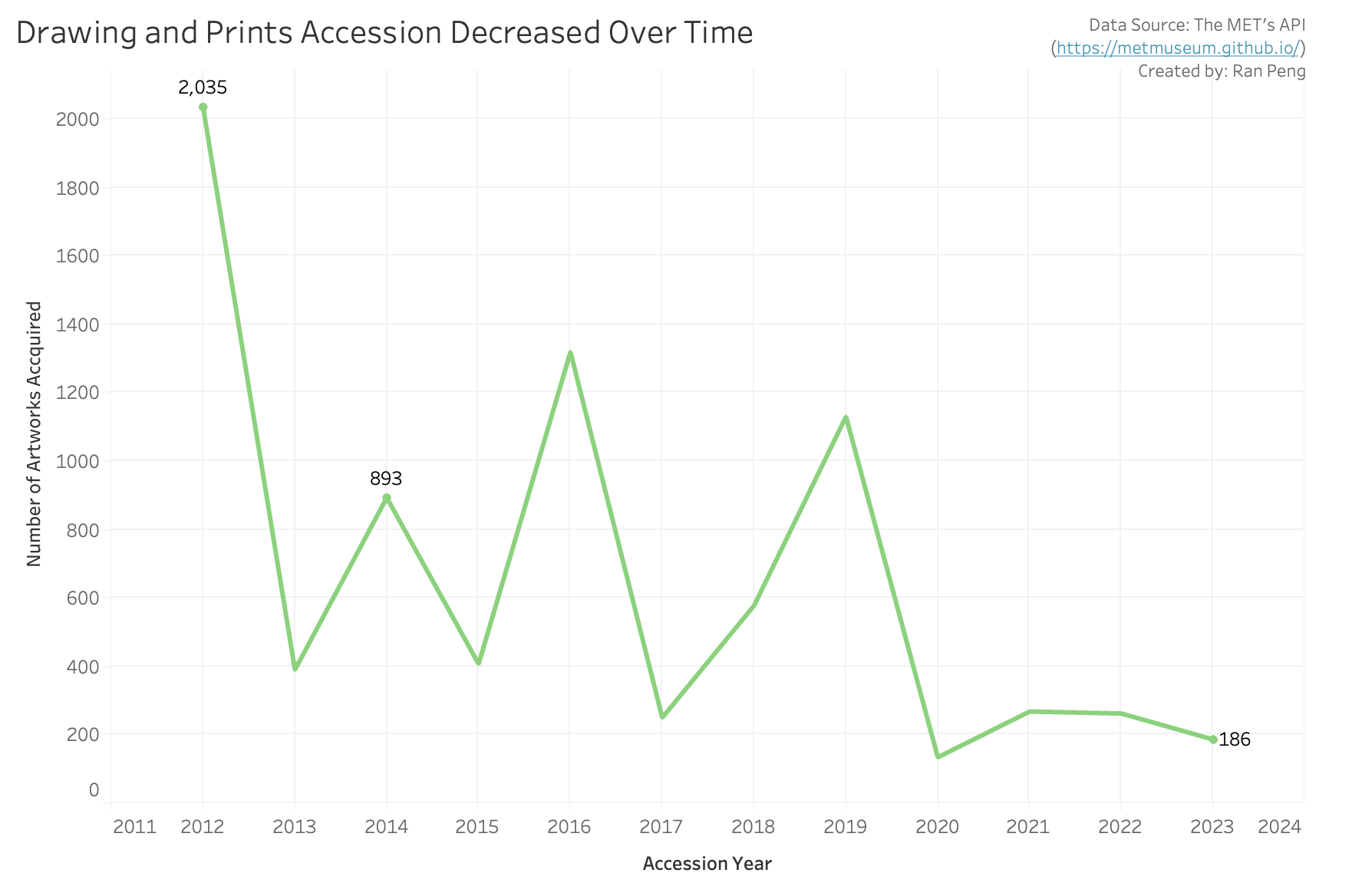 From 2012 to 2023, the MET acquired fewer drawings and prints, which decreased from 2035 items per year to 186 items per year.