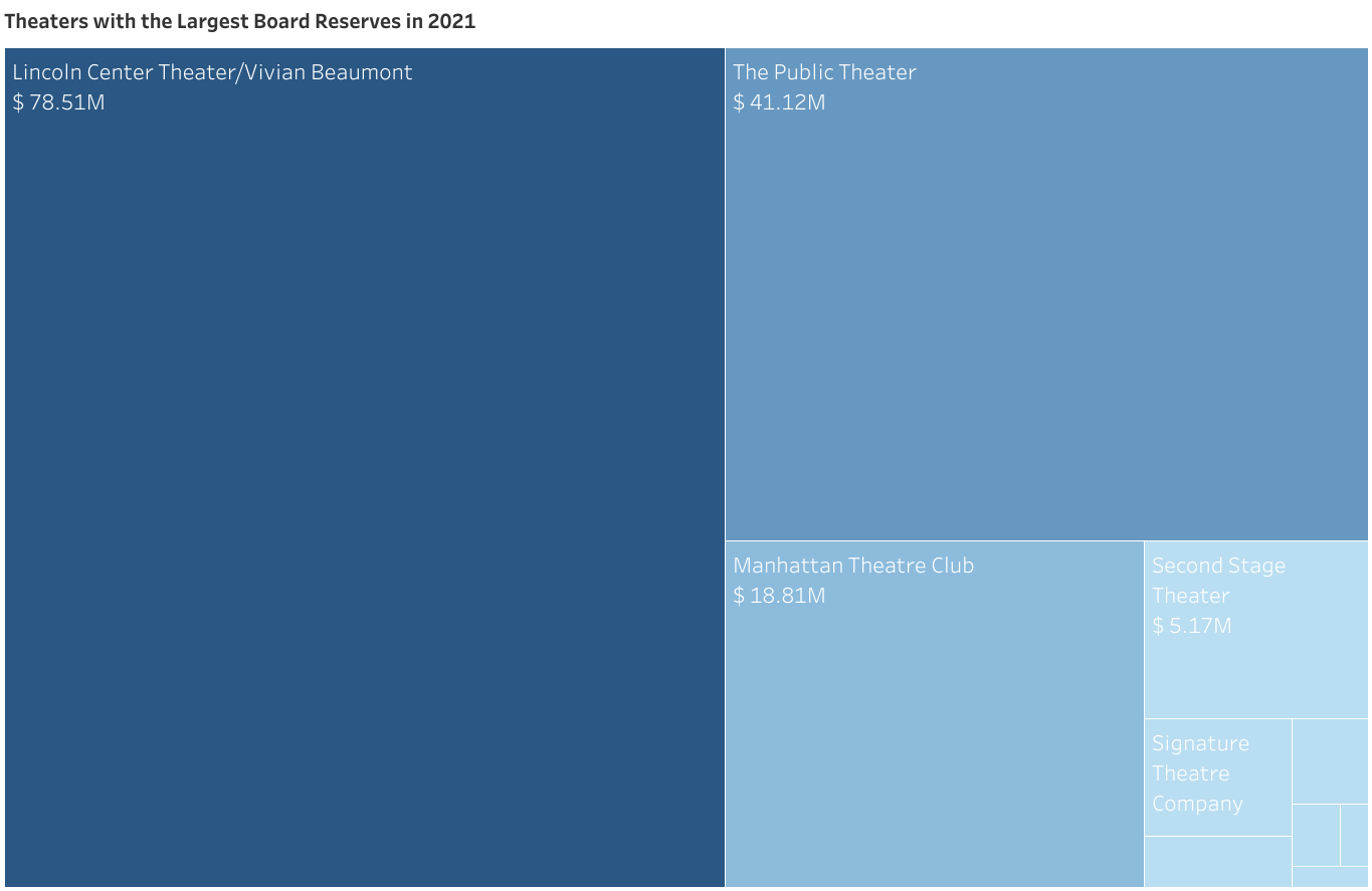 Organizations like Lincoln Center Theater, The Public Theater, and Manhattan Theatre Club have some of the largest reserves in the theater industry.