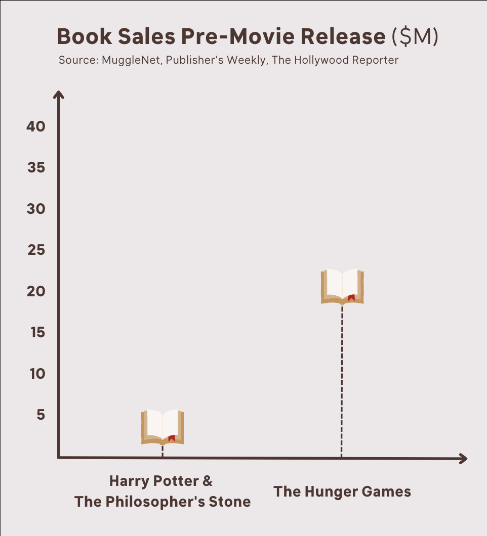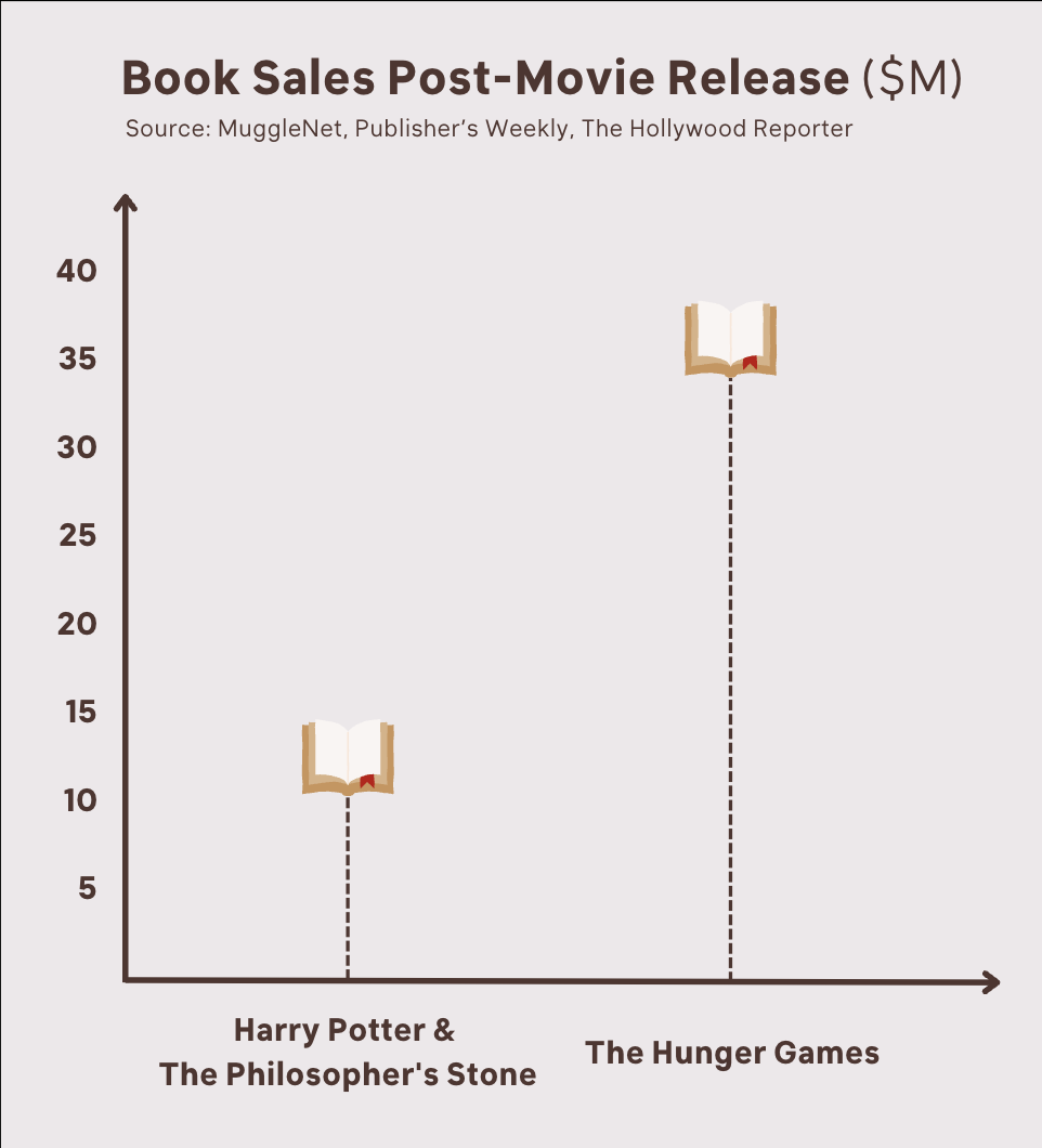 Hunger Games and Harry Potter & The Philosopher's Stone particularly saw massive surges in book sales particularly from one year prior to the release of the movie to immediately after. This trend can be seen for most YA titles (Lewis, 2012) (The Book That Started It All: Celebrating 25 Years of “Harry Potter and the Philosopher’s Stone,” n.d.).