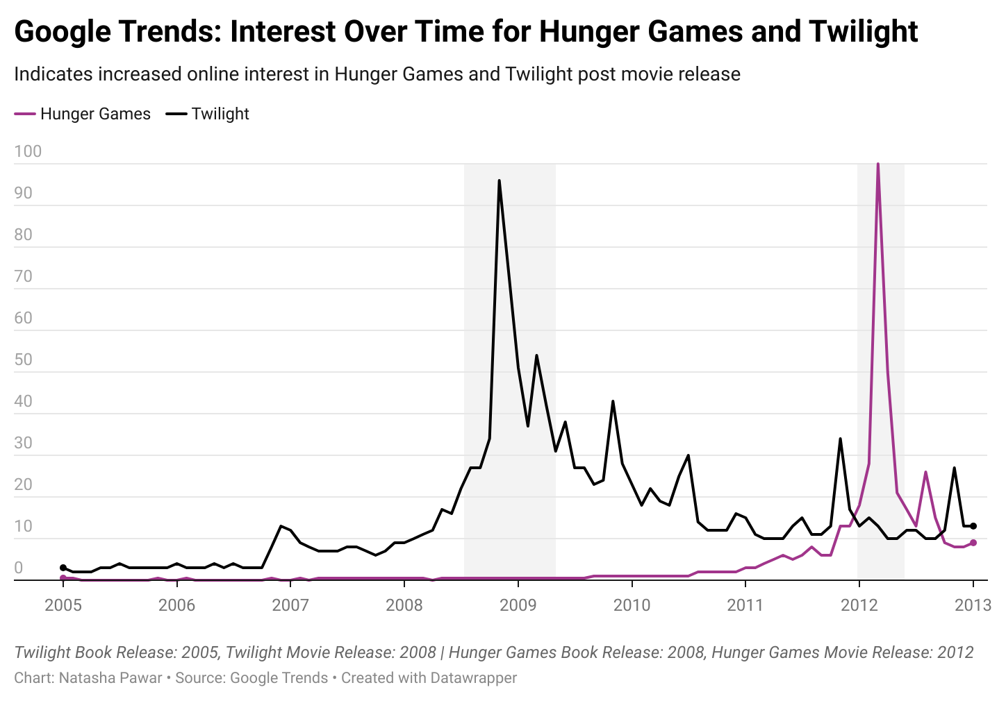 Google Trends. “Google Trends.” Accessed February 28, 2025. https://trends.google.com/trends/explore?date=2005-01-01%202013-01-01&geo=US&q=hunger%20games,twilight&hl=en.