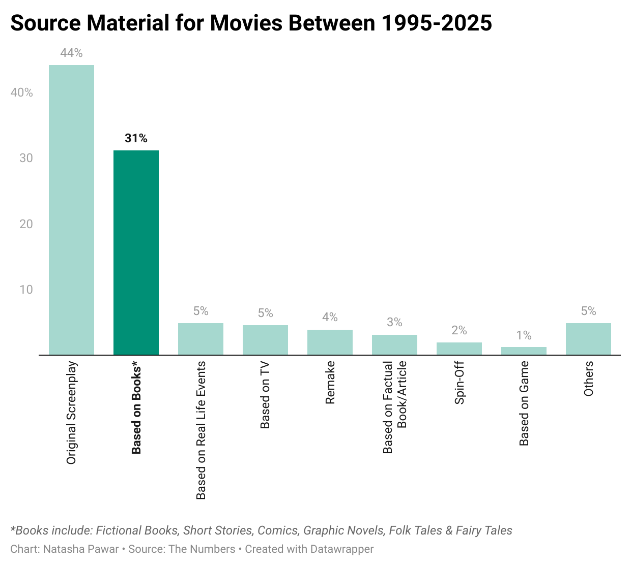 Data from The Numbers suggests that between 1995 and 2025, the second leading source of box office revenue comes from movies that have been derived and adapted from books, at a grand total of 31% (Sources Movie Breakdown 1995-2025, n.d.). Furthermore, recent trends indicate that majority of these adaptations are primarily in the YA and contemporary genre (Why Hollywood Is Turning to Books for Its Biggest Productions | The Verge, n.d.).