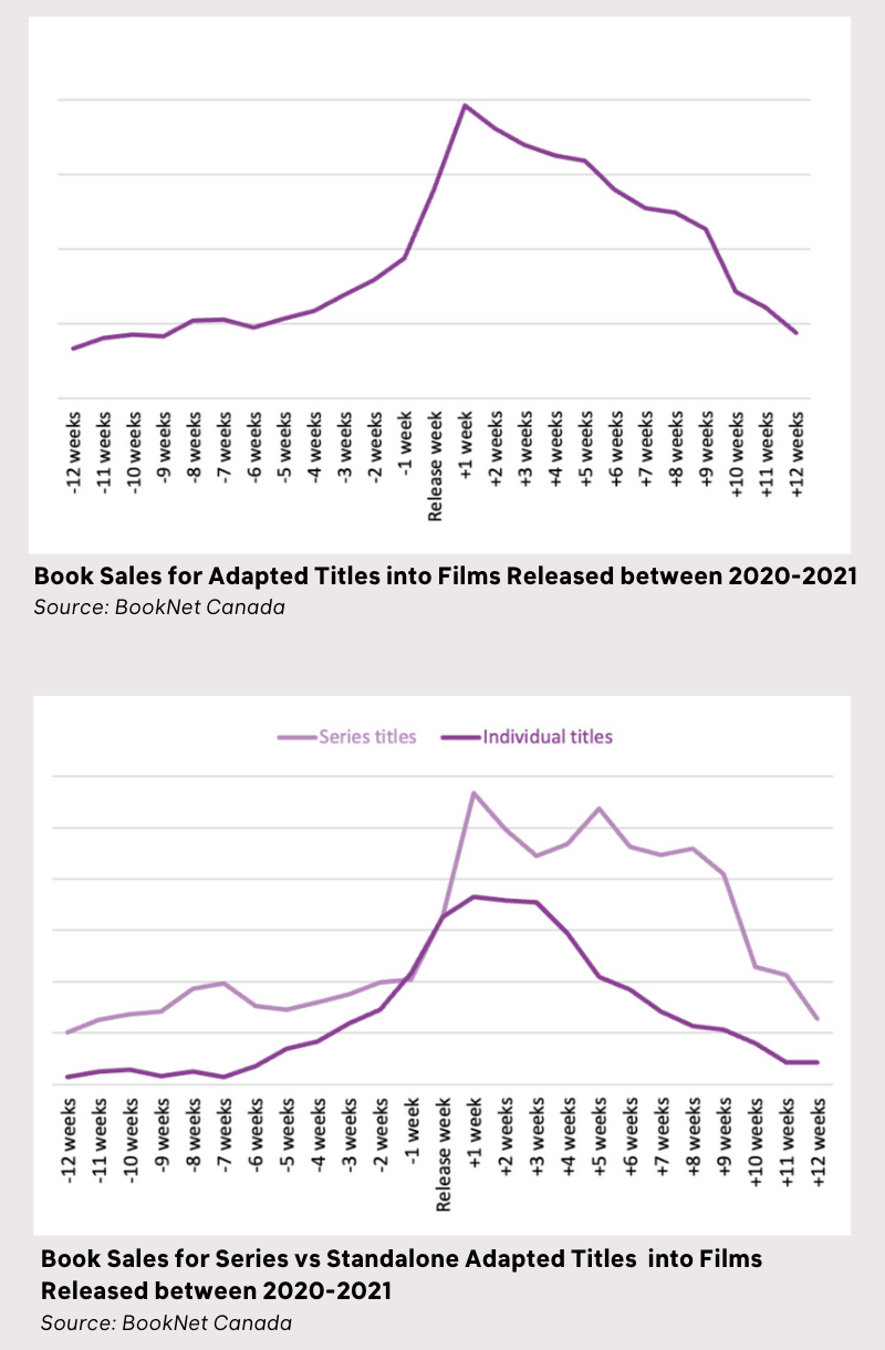 Books are also often adapted to television shows. Since 2016, according to 3Vision, more than 70% of Netflix's SVOD original titles have been adapted works (Book Adaptations on the Rise as Studios Consider Them a Safer Bet | 3Vision, n.d.). These shows have similar results on book sales. According to data from BookNet Canada studying 30 adapted film titles released between 2020 to 2021, there was a 979% increase in sales for books between 12 weeks prior to a movie release to 1 week post release (Must-Watch, Must-Read, 2022a).