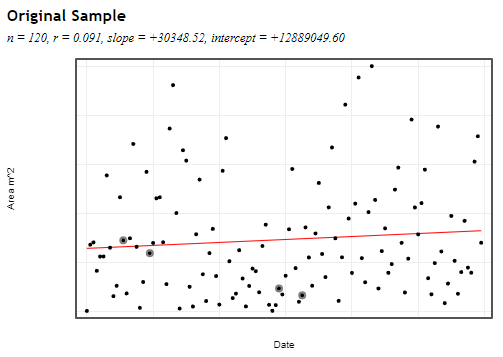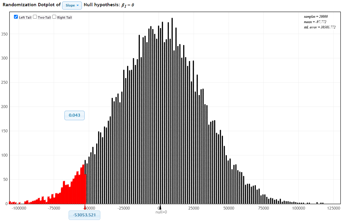 Using a left-tailed test comparing the post-wasting data (2014-2023) with the sampling distribution allows us to claim at a p-value of 0.043 that the trend of kelp forest abundance, measured by area in square meters, since 2014 is different than the trend beforehand. While this does not offer definitive proof that the onset of the sea star wasting syndrome pandemic in 2013/2014 is the cause of the decline, more thorough statistical analysis may reveal connections between kelp forest abundance and sunflower sea star abundance in the future.