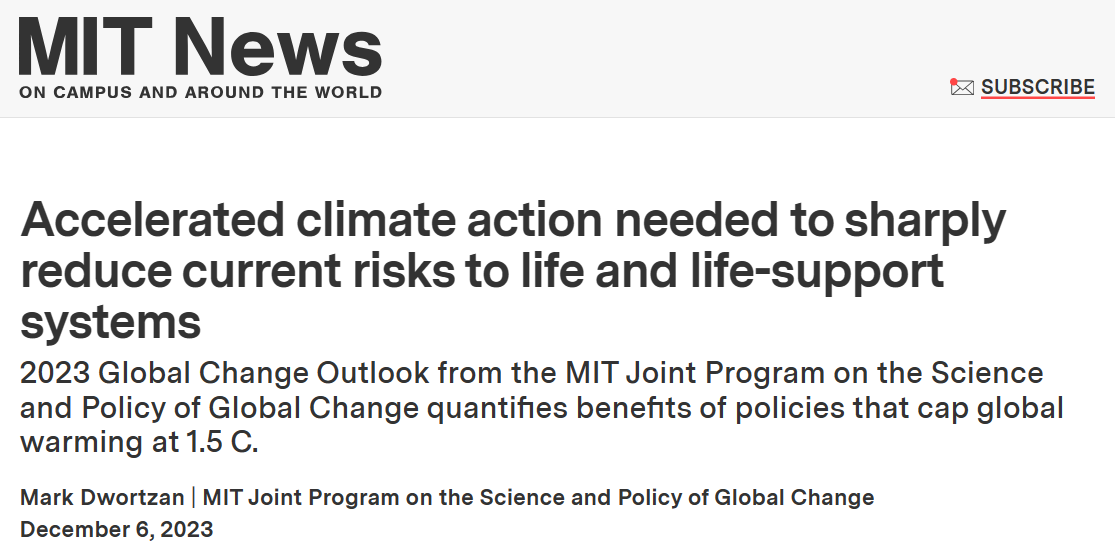 The 2023 MIT Global Change Outlook report presents Accelerated Actions,' aiming for a more rapid shift to limit global warming to 1.5 degrees Celsius by century's end through a major shift from fossil fuel energy production to renewable and sustainable energy.