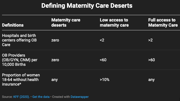 There is a concerning number of maternity care deserts that lack access to obstetric hospitals, centers, and providers. A report published by March of Dimes found that 36% of U.S. counties (largely in the Midwest & South) lack resources for pregnant families. Women and infants in maternal care deserts face higher risks of poor health outcomes and preventable death (Treisman, 2022).