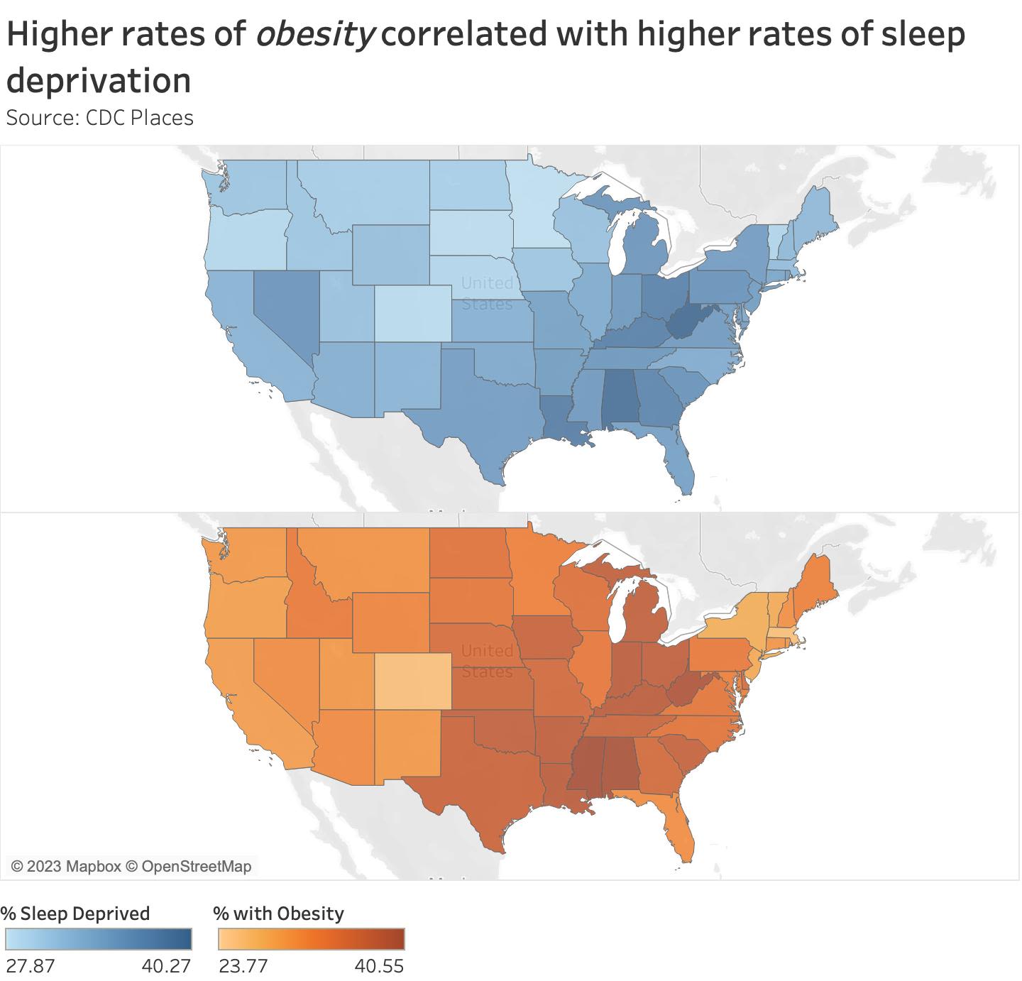 Additionally, inadequate sleep has been linked to a higher risk of negative health outcomes.12 As seen in the graphs below, short sleep duration is positively correlated with depression, obesity, and diabetes. Additionally, as seen in the maps below, the South and East in the U.S tend to have high higher rates of sleep deprivation and higher rates of obesity and diabetes.