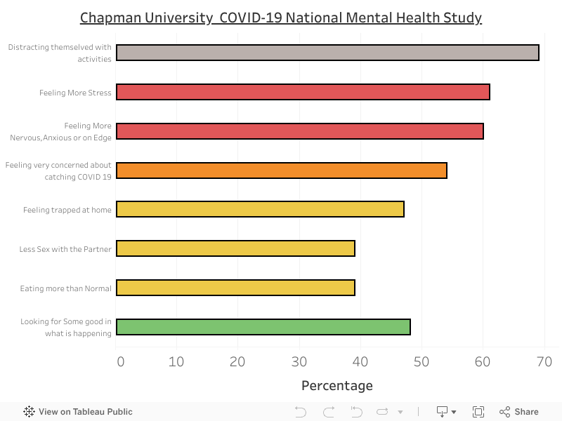 Chapman University conducted a study on different mental health impacts due to COVID based on a National Survey with 4149 respondents. The survey was basically to find out how American people are responding based on the COVID impact. Survey results found that most of the people felt additional stress and depression. Below visualization is based on the Chapman data. Visualization confirms majority of the people are affected with some or other mental perturbance.